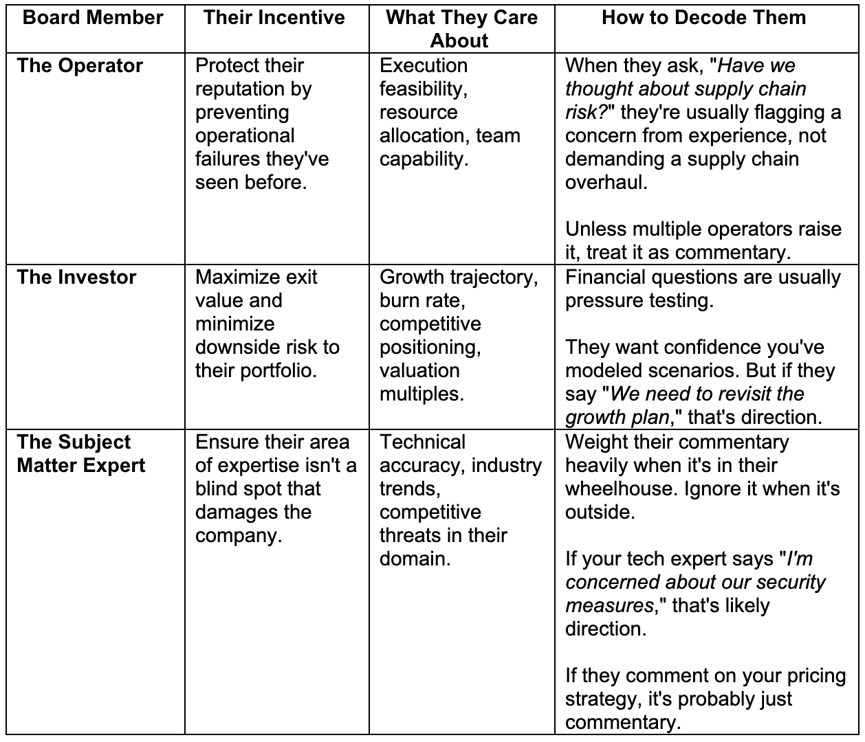 Board members speak in four distinct modes – commentary, pressure testing, direction, and political theater. Understanding which mode they're in, combined with decoding their underlying incentives, is how you prevent costly misinterpretations.