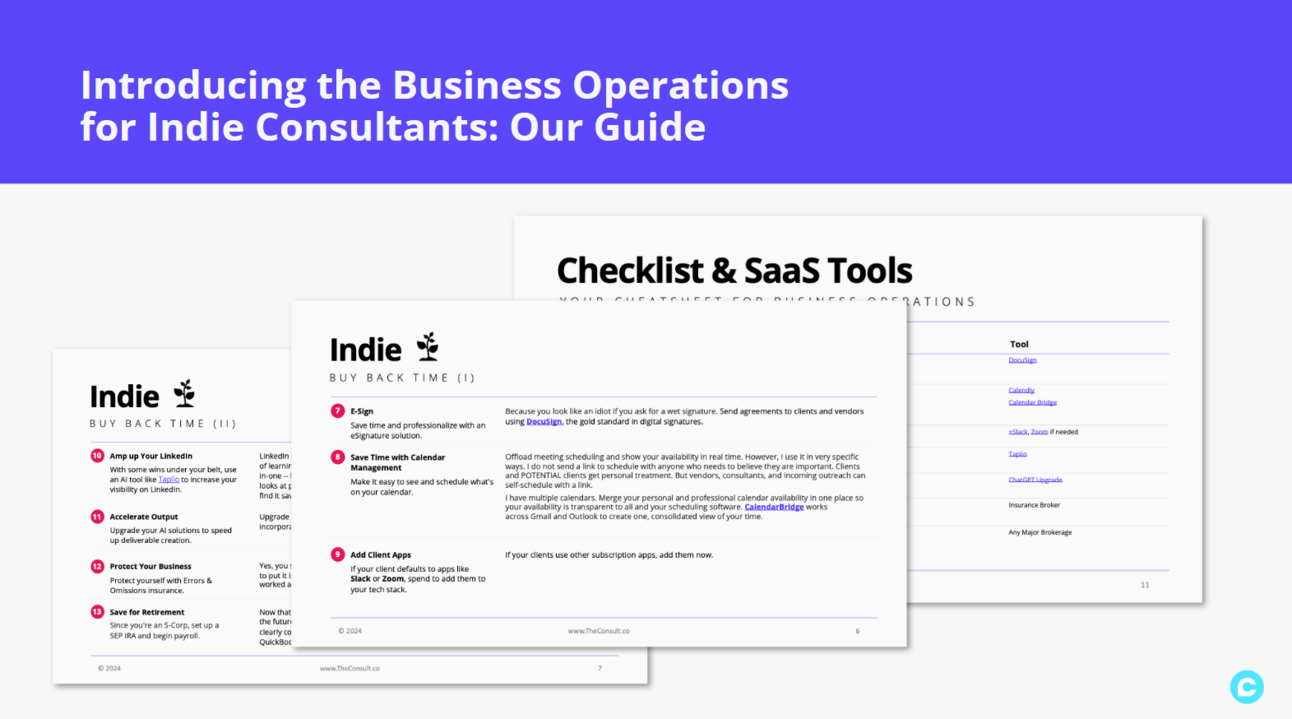 If you’re not already, all you have to do is become a Community member to access the workshop recording and download the accompanying resource, Business Operations for Indie Consultants: Our Guide.