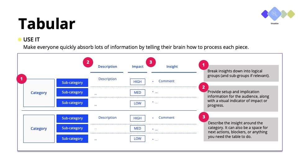 Use a tabular framework to sort information and tell the brain how to process each piece.