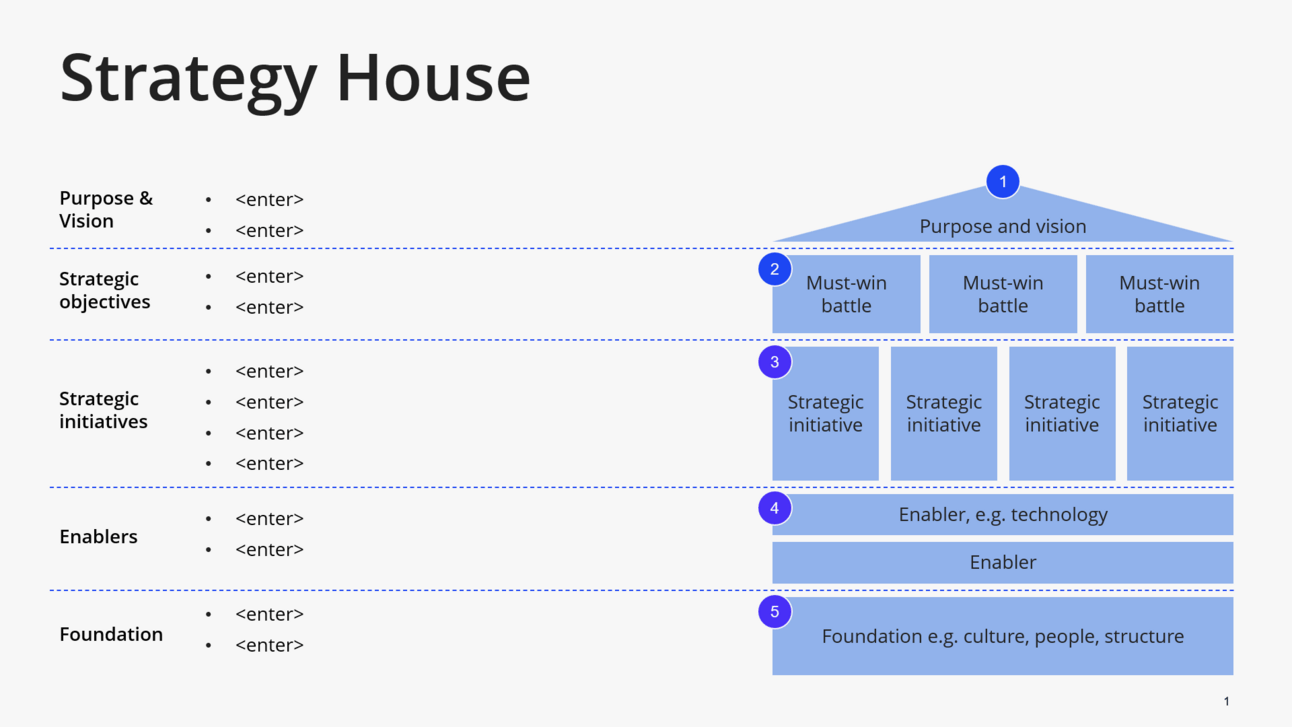 Strategy House: This template covers everything your project needs – from the clear purpose and vision down to the foundations, and everything in between.